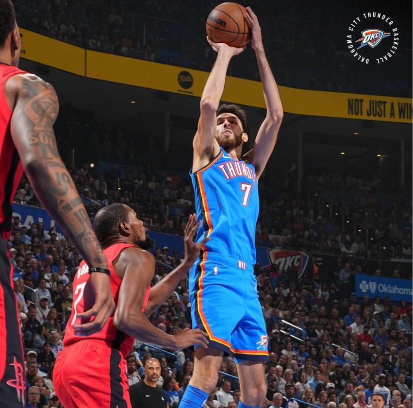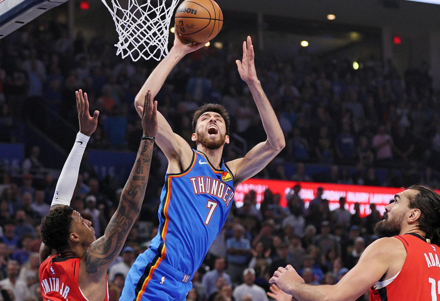 次節開場切特面對申京又完成2+1,切特踩線超遠中投(本場第二個),他第八次出手才投丟,第九個球是真的三分結果沒進,次節4中2拿到5分3籃板,半場霍姆格倫18分鐘,9中7拿到18分4籃板苦撐全隊,SGA半場只有5分。