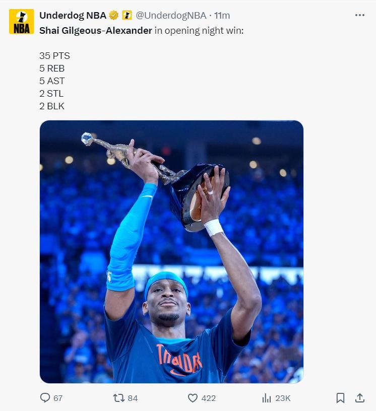 SGA在下半場才發威,第三節6分,末節5中4拿到12分3籃板1助攻1搶斷,他上半場只有5分,是他末節的表現幫助雷霆拖入加時賽。進入加時賽切特命中三分,隨後亞歷山大又命中三分,雷霆領先到6分,SGA中投繼續有,切特再中三分,申京傳球被SGA斷掉,SGA絕殺未能命中。
