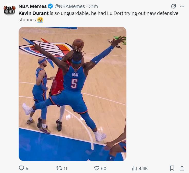 杜蘭特全場比賽47分鐘,16中9,三分4中0,拿23分9籃板3助攻6犯規4失誤,命中率56.3%,杜蘭特這場比賽三次犯錯。