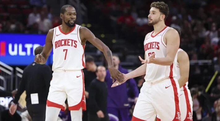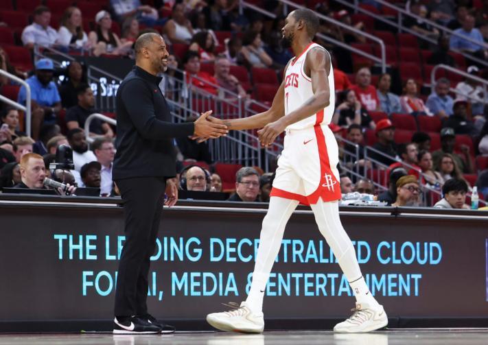 但這場比賽對火箭來說並非毫無意義。23歲的申京用8投5中的三分球展示了自己仍在進步,22歲的阿門能輕鬆頂飛霍姆格倫完成終結,亞當斯老而彌堅,小史密斯時有驚喜,他們證明了自己能與聯盟最頂尖的球隊對抗58分鐘。而這一切,都和杜蘭特的到來息息相關。