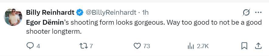 籃網記者:傑明的投籃姿勢看起來美極了。長期來看必然一個出色的射手。