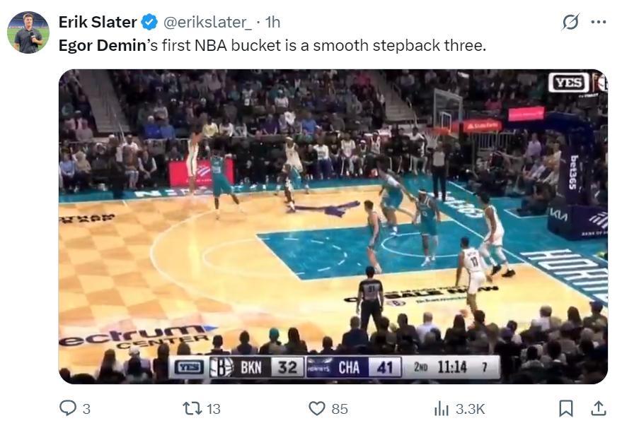 傑明第二節打了4分鐘命中一個喫球的撤步三分球,第三節他兩次接球三分投籃都命中,前4次三分出手命中三個,籃網記者已經爲他喝彩。
