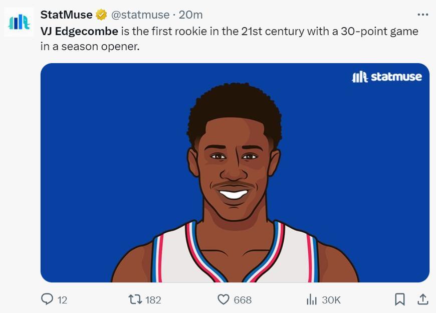 美媒報道,埃奇庫姆成爲21世紀首位揭幕戰就拿到30+的新秀。