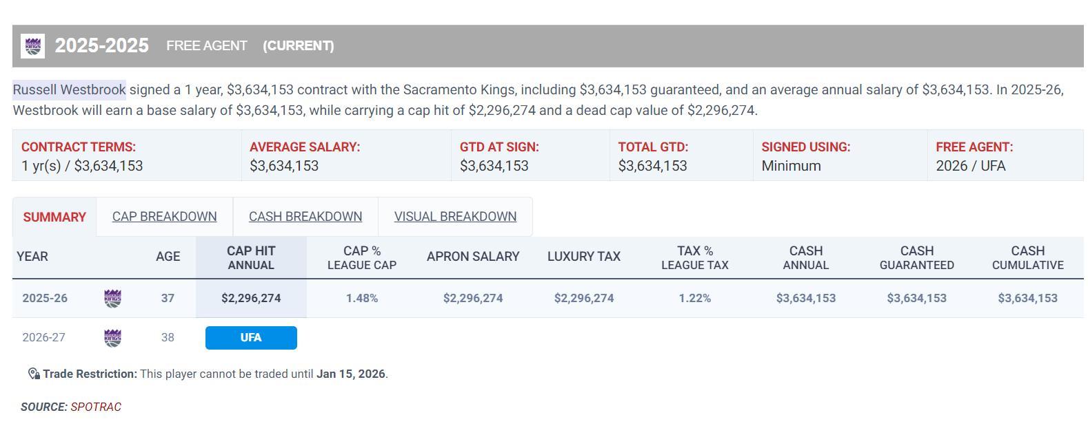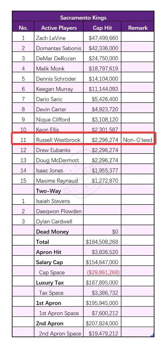 威少363萬隻佔用229萬的薪金空間,而且威少這份底薪是不保障性合同,國王一旦覺得他表現不佳隨時可以裁掉他。