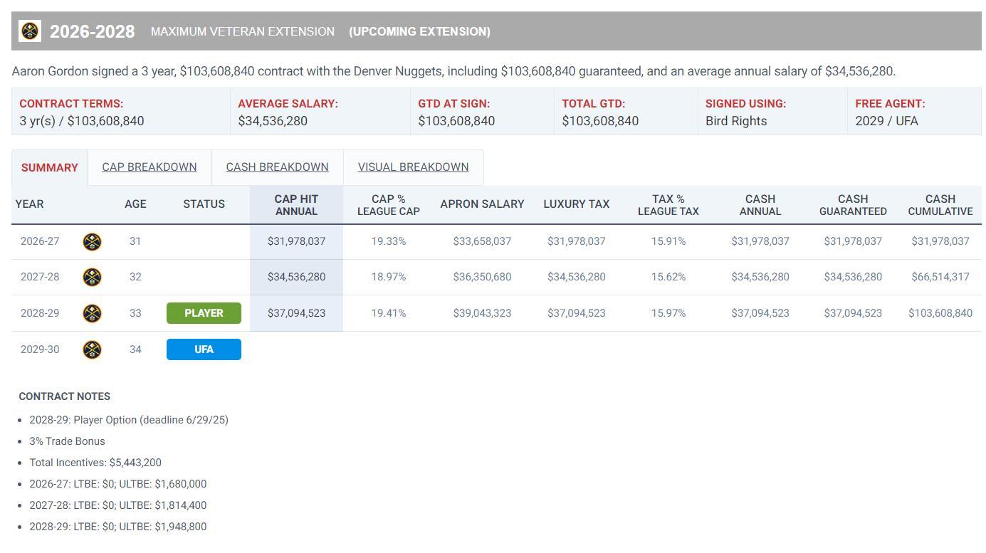 戈登的新合同是三年1.03億,算上他25-26賽季價值2300萬的薪水,他未來四年是1.26億,他今年30歲,這份合同可以在他巔峯下滑前將他都留在丹佛,真的大賺。
