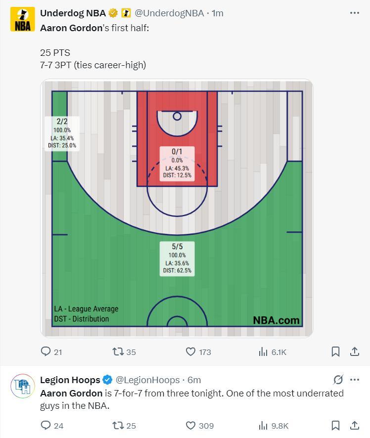 美媒LG:戈登半場三分7中7,他是NBA歷史上最被低估的球員。