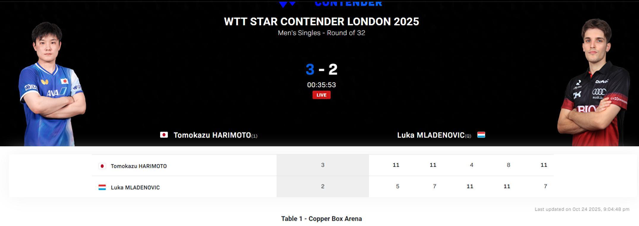 北京時間10月24日,WTT倫敦球星挑戰賽男單1/16決賽,張本智和3-2姆拉德諾維奇,五局比分:11-5、11-7、4-11、8-11、11-7。張本智和一度2-0大比分領先被拖入決勝局,頭號種子+世界排名第四涉險過關。