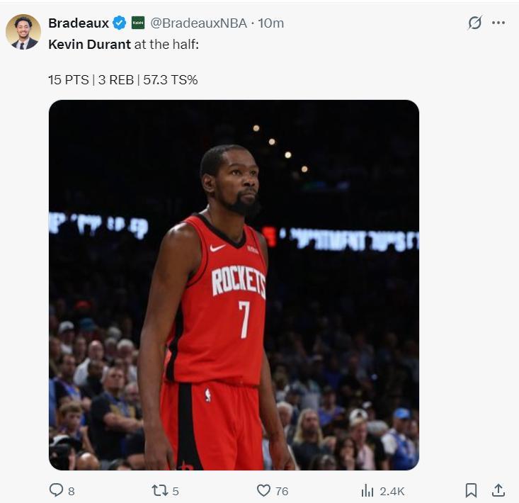杜蘭特此役的上半場也是火箭唯一上雙的,17分鐘,10中4,三分1中1,罰球7中6拿到15分3籃板1搶斷1蓋帽0失誤,當KD有體能時他就是如此不可阻擋。