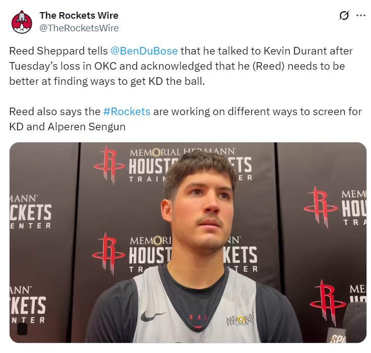 謝潑德在賽前的採訪中談到,自己應該想到更多辦法將球傳給杜蘭特,火箭隊也在研究不同的方法爲杜蘭特、申京進行掩護。