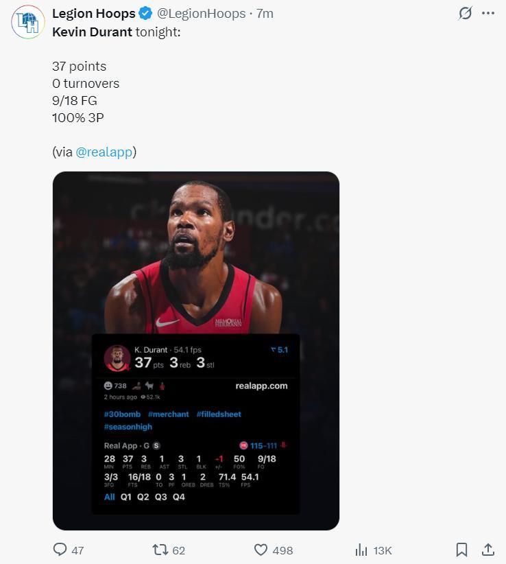 全場比賽,杜蘭特28分鐘,18中9,三分3中3,罰球18中16,拿到37分3籃板1助攻3搶斷1蓋帽0失誤,命中率50%,三分命中率100%,真實命中率71.4%,正負值-1,這樣的表現都輸球了。