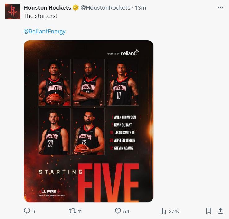 火箭:申京17分7籃板7助攻,杜蘭特37分3籃板,阿門10分4籃板,小賈11分4籃板,亞當斯11分10籃板,奧科吉10分4籃板,謝潑德9分2籃板。