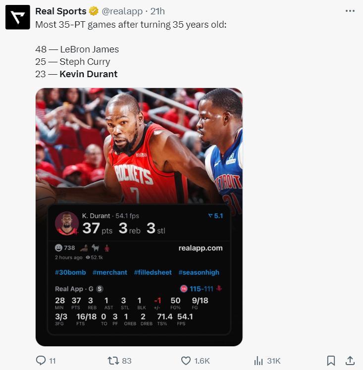 杜蘭特35歲以上拿到23次30+也是歷史第三,僅次於詹姆斯、庫裏,要知道這場比賽杜蘭特只打了短短28分鐘而已。
