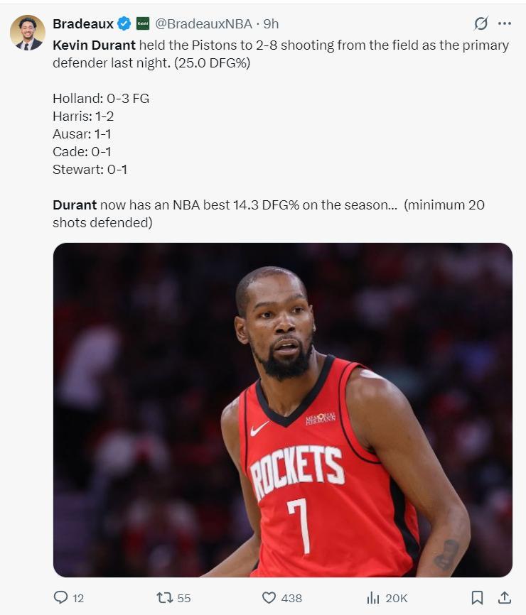 37歲的杜蘭特真的已經竭盡全力了,對活塞他作爲防守者時,霍蘭德3中0、哈里斯2中1、奧薩爾1中1、CC1中0、斯圖爾特1中0,他的防守回合轉化率達到14.3%已經是聯盟最頂級的防守者。