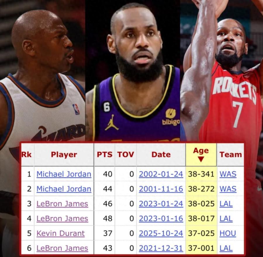 對陣活塞一戰,凱文-杜蘭特出戰36分鐘,18投9中,其中三分球3投3中,罰球18投16中,得到37分3籃板1助攻3搶斷1封蓋0失誤,他成爲NBA歷史上第三位37歲以上拿37+0失誤的球員,比肩喬丹、勒布朗。