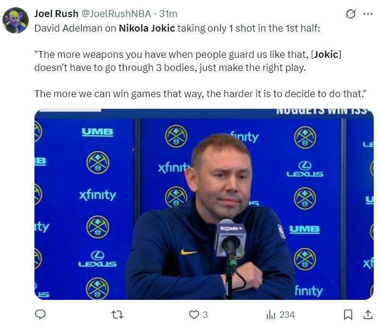 賽後掘金主帥大衛-阿德爾曼談到了約基奇的發揮:約基奇上半場只有1次出手是因爲他閱讀對方的防守,當所有人都在包夾他對他嚴防死守,他就不必硬要自己進攻,他有諸多武器可以幫助球隊,越是這樣我們全隊越打得輕鬆。