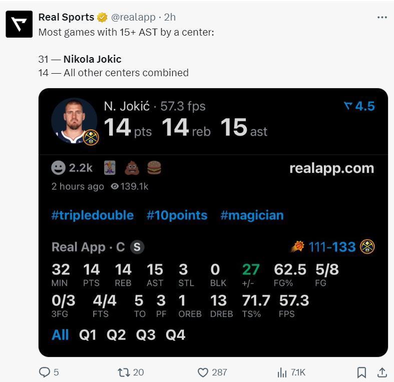 4.約基奇第31次15+助攻,其餘中鋒合計14次;