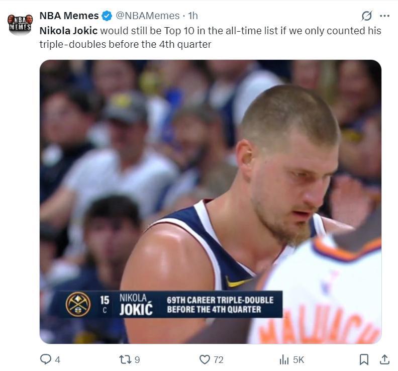 5.約基奇三節69次三雙也進入歷史三雙榜單前十;