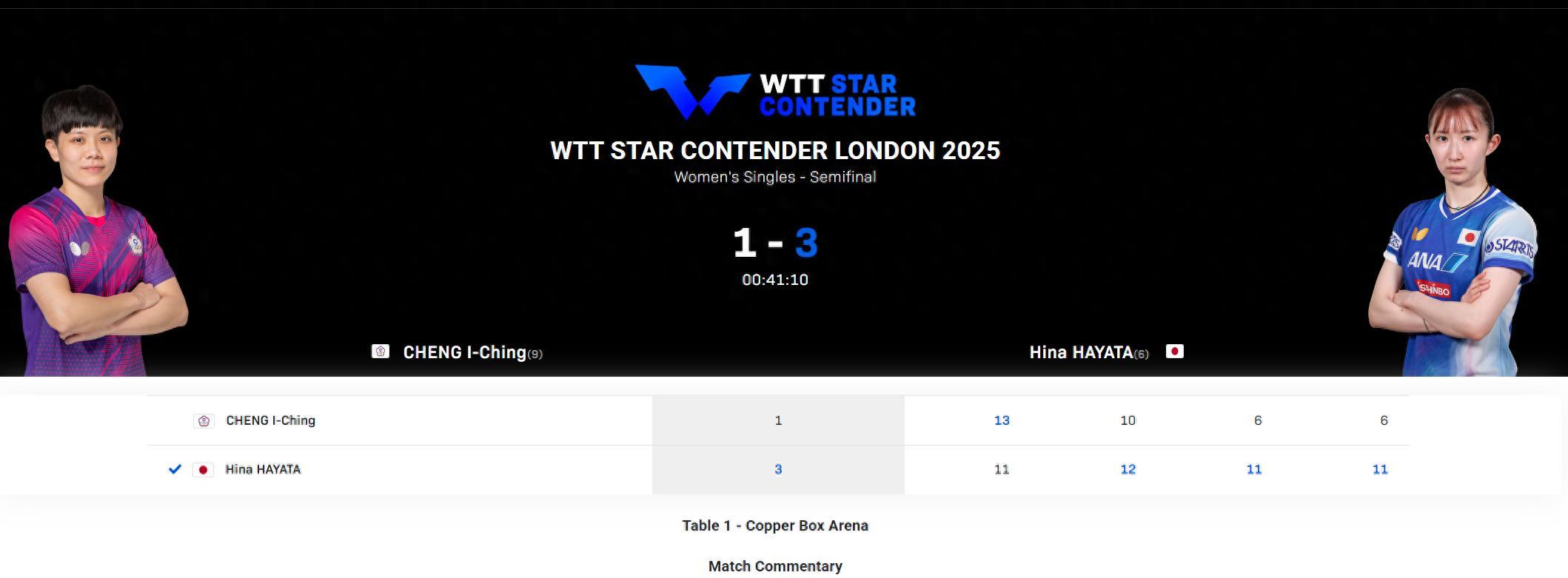 北京時間10月26日,WTT倫敦球星挑戰賽女單半決賽,早田希娜3-1逆轉鄭怡靜晉級決賽,四局比分:11-13、12-10、11-6、11-6。早田會等待張本VS橋本的勝者,所以日乒提前包攬冠亞。