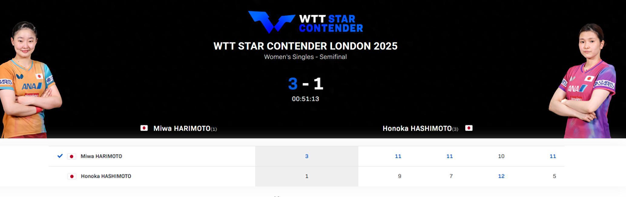 北京時間10月26日,WTT倫敦球星挑戰賽,日乒內戰,張本美和3-1擊敗橋本帆乃香,四局比分:11-9、11-7、10-12、11-5。決賽是張本美和VS早田希娜,張本美和自橫濱冠軍賽1/8決賽炮轟早田希娜醫療暫停後單打2連敗+雙打2連敗,張本能打破心魔嗎?