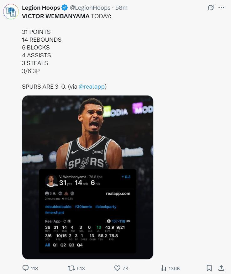 此役文班亞馬36分鐘,21中9,三分6中3,罰球15中10,拿到31分14籃板4助攻3搶斷6蓋帽2失誤,命中率42.9%,三分命中率50%,真實命中率56.2%,文班亞馬依舊是攻防一體的表現。
