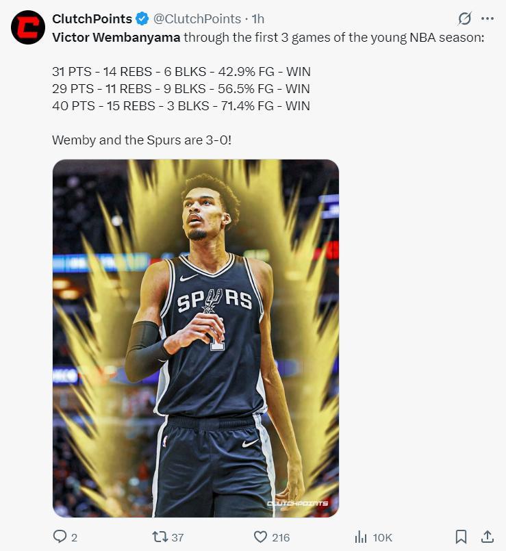 開賽季的三場比賽文班亞馬分別拿到31+14+6帽、29+11+9帽、40+15+3帽,場均32.7分鐘,拿到33.3分13.3籃板2.3助攻1.7搶斷6蓋帽,命中率59.6%,三分命中率36.4%,最關鍵的本賽季文班亞馬場均僅0.7次失誤。