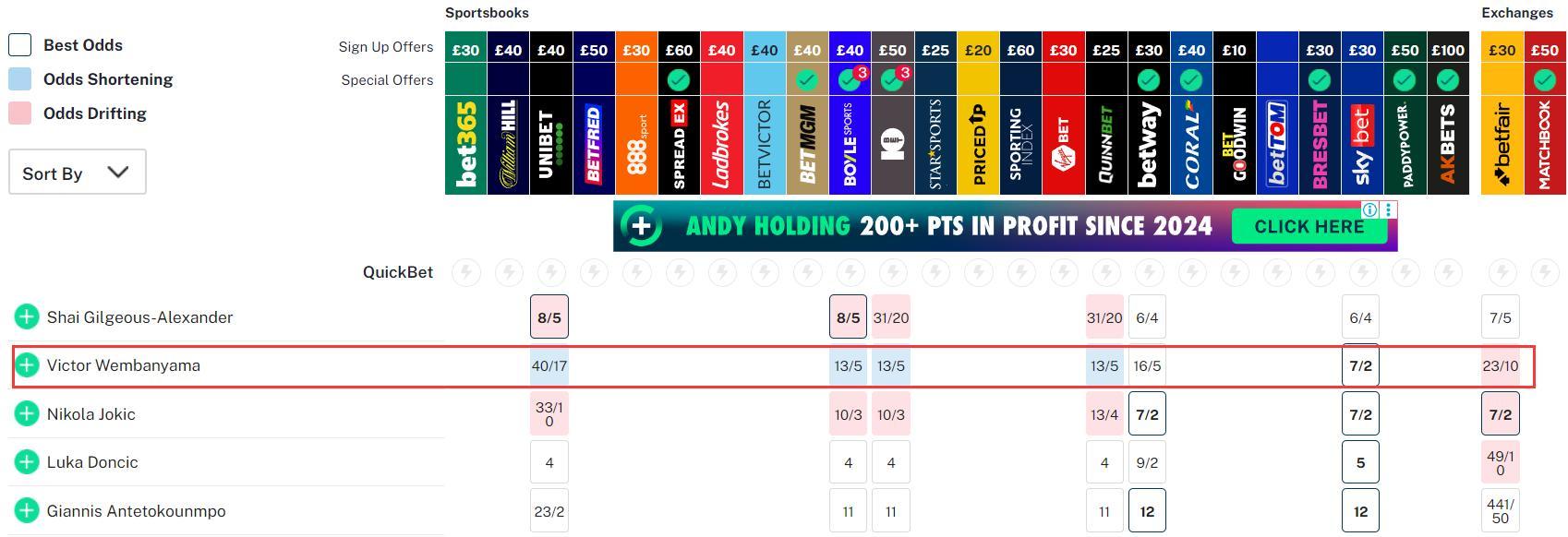 除此之外,文班亞馬的MVP賠率也僅次於亞歷山大排在第二的位置,雷霆、馬刺目前都是三連勝,馬刺衝到西部第二這你敢相信嗎?