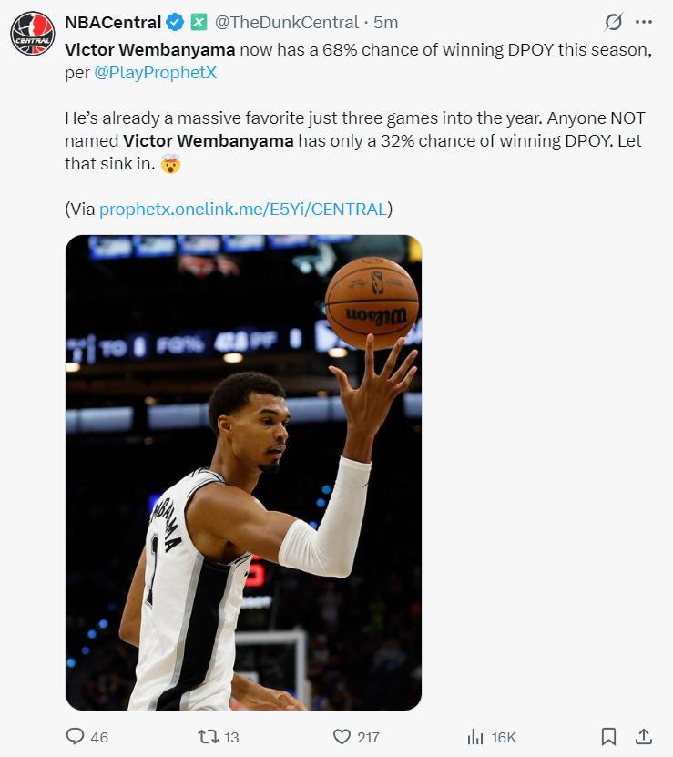 根據數據媒體PlayProphetX的數據預測,文班亞馬本賽季獲得DPOY(最佳防守球員)的概率已經達到68%,他僅僅出戰三場比賽就成爲DPOY的第一熱門人選,其他人合計只有32%的概率。