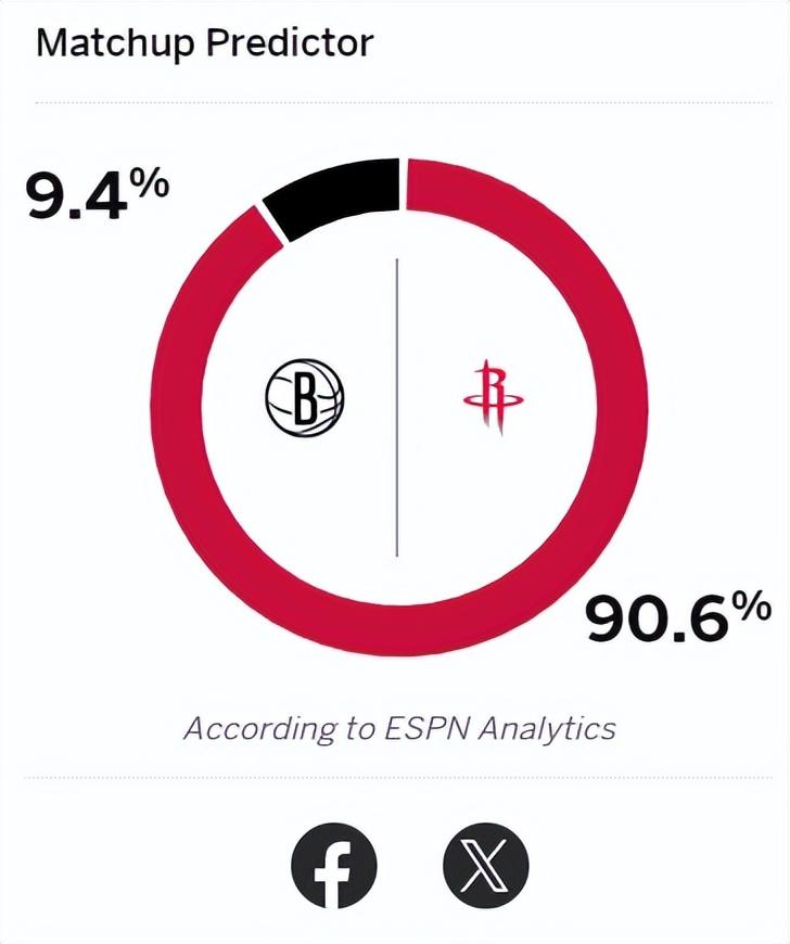 ESPN預測火箭在對陣籃網這場比賽時贏球概率高達90.6%,而來訪的籃網只有9.4%,拿到這場勝利後烏度卡應該能鬆口氣吧。