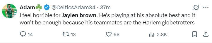 凱爾特人媒體:爲杰倫布朗感到難過,他目前的狀態堪稱最佳,但僅靠他一人遠遠不夠,他身邊的球員都沒能發揮出應有的水準。