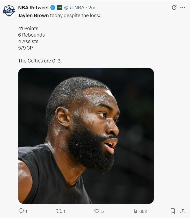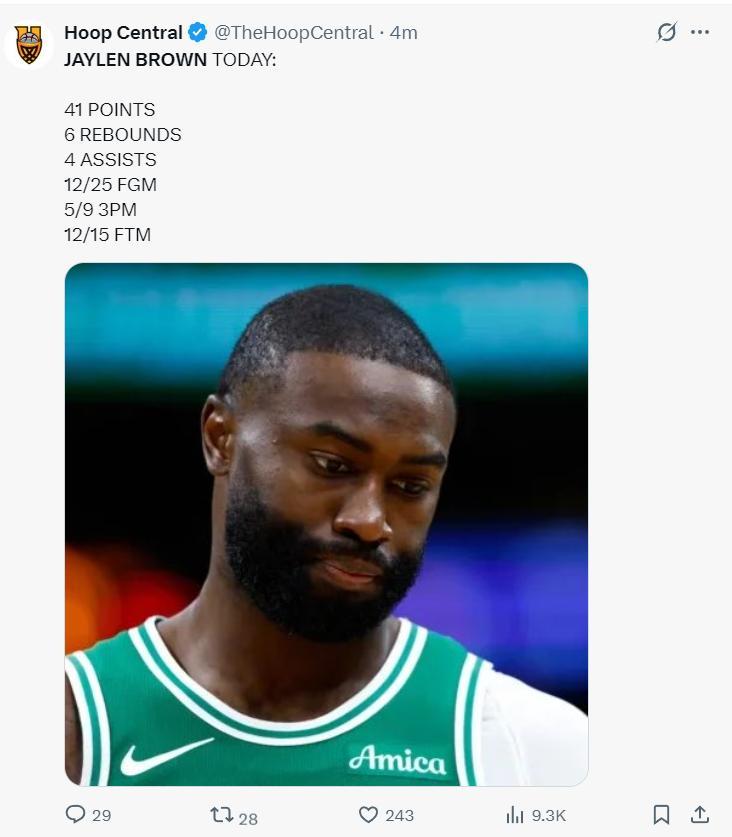 布朗開賽季的三場比賽都拿到20+,首戰23分,次戰25分,這場比賽拿到41分,但綠凱就是無法拿到勝利。