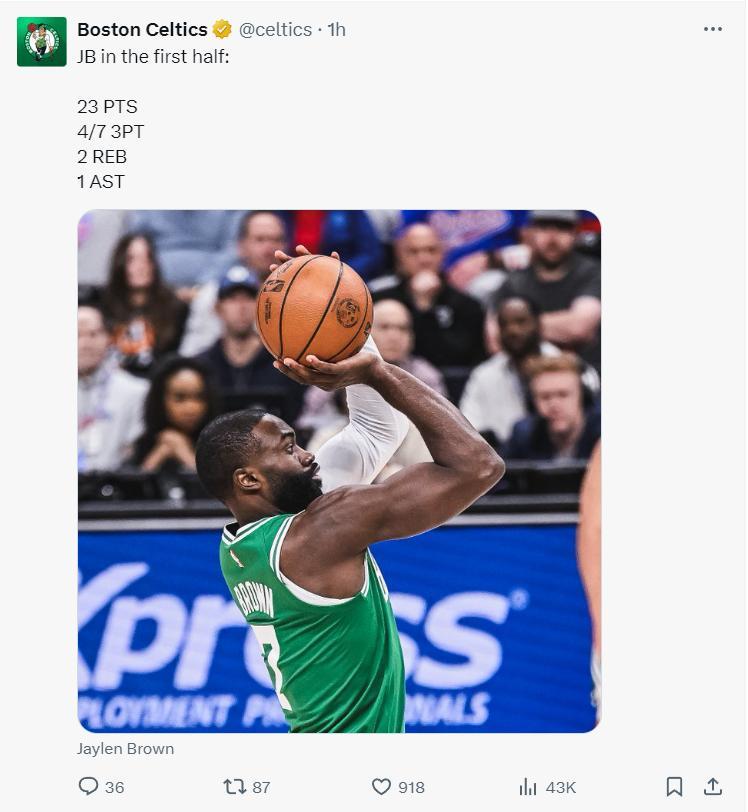 杰倫布朗開場手感就很好,5分鐘裏5中4+三分2中2拿到10分,如果不是早早2次犯規,綠凱在首節可以領先的更多。上半場布朗15分鐘,13中7,三分7中4,拿到23分2籃板1助攻,他個人發揮沒有任何問題。