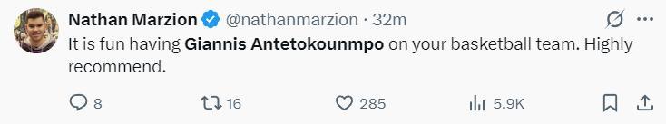 雄鹿記者Nathan Marzion:有揚尼斯-阿德託昆博這樣的球星在隊伍裏實在是太幸福了。
