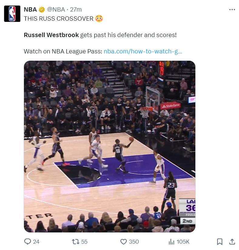 威少回頭這個表情太囂張了,拿着360萬底薪的少爺一戰就征服了薩克門託球迷,他打球是真的好看,積極性非常足。替補席的拉文都起身爲威少吶喊。