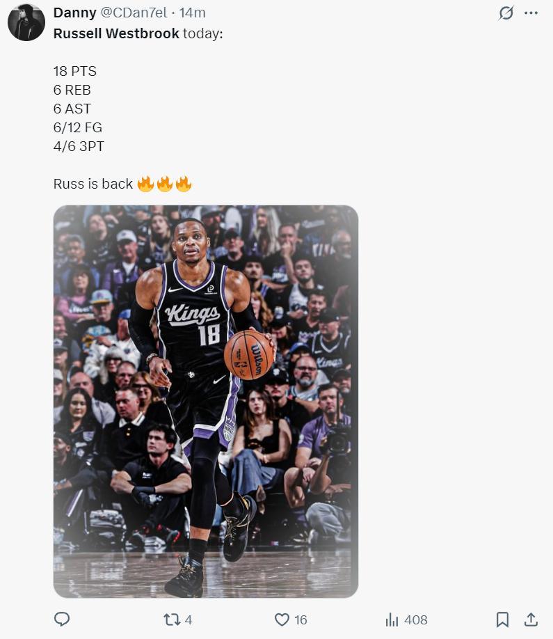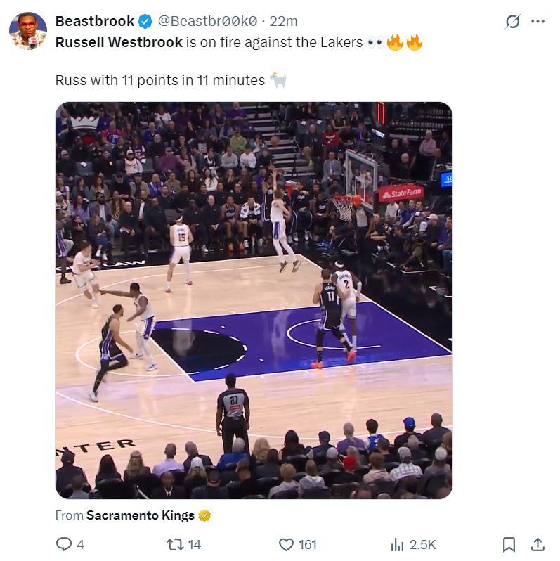 這場比賽是威少國王生涯首次對上老東家湖人,在威少離開湖人後就成爲了聯盟知名流浪漢,所以外界都覺得威少與湖人算是冤家,少爺打湖人也真是強勢,連續的三分球命中,上半場命中3個三分球,而此前的兩場比賽三分4中1。