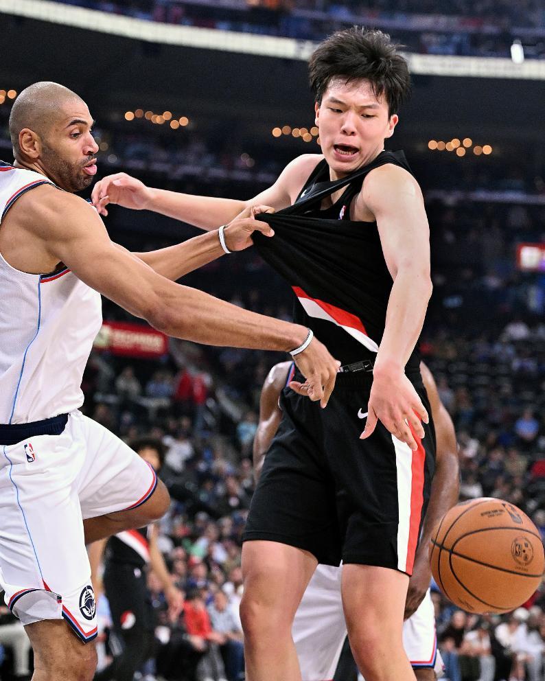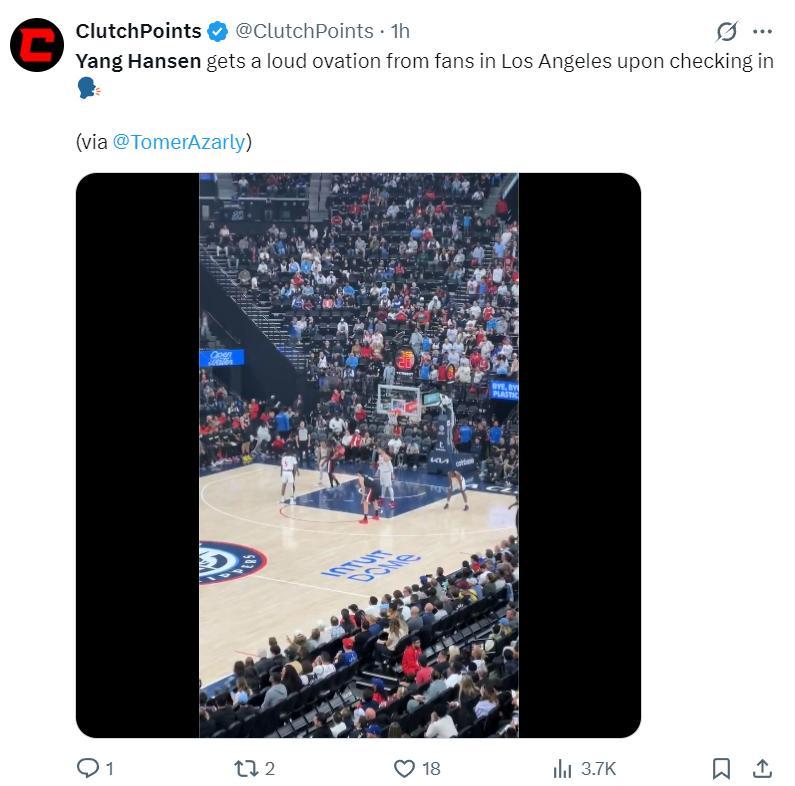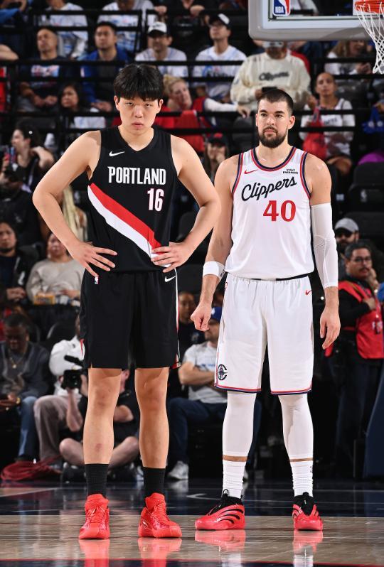 這是楊瀚森職業生涯首次來洛杉磯打常規賽,這裏的球迷們給了楊瀚森巨大的歡呼聲,楊瀚森在首節還剩4分20秒時登場,他直接對位快船先發中鋒祖巴茨,楊瀚森的身高還比祖巴茨高2釐米,但兩人的身體圍度差距明顯。
