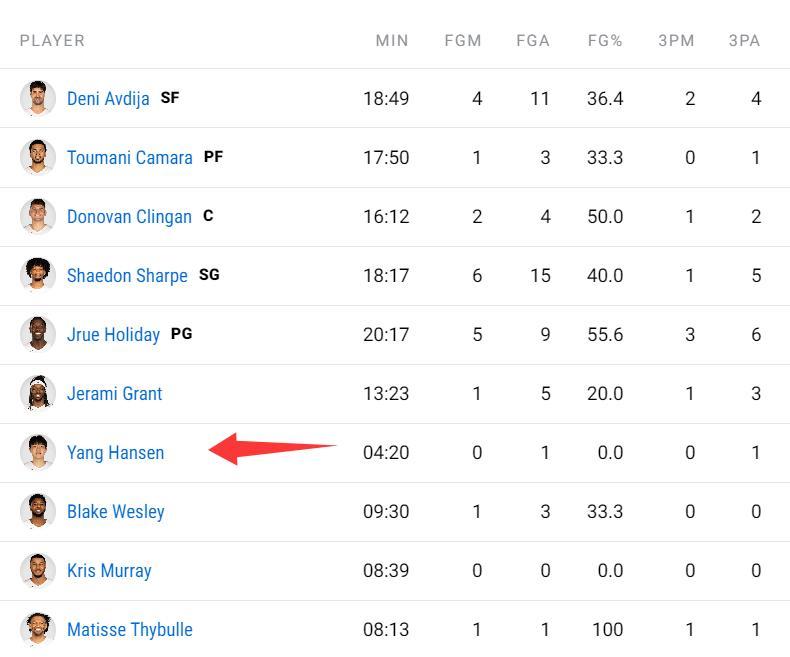 整個上半場楊瀚森只打了4分20秒,1中0,罰球2中2,拿到2分1籃板0助攻。(楊瀚森在面對有兩位高大內線大洛、祖巴茨時輪換時間似乎也沒有提升)