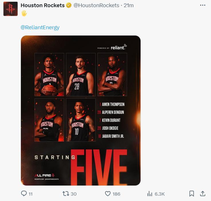 火箭:杜蘭特19分6籃板(三節打卡),申京21分6籃板6助攻,阿門12分8助攻4籃板,小賈11分4籃板,奧科吉10分,謝潑德15分8助攻,伊森22分5籃板5助攻1蓋帽0失誤。
