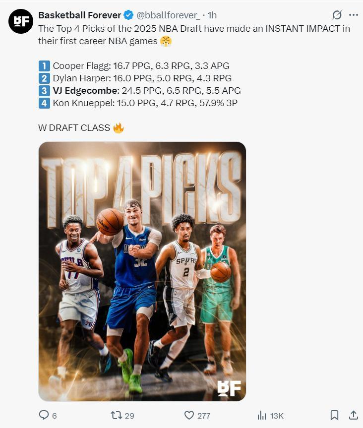開賽的兩場比賽聯盟這是超級新秀們的數據,埃奇庫姆場均24.5分6.5籃板5.5助攻明顯優於狀元伏格列、榜眼哈珀,埃奇庫姆這位探花已經被譽爲艾弗森接班人。