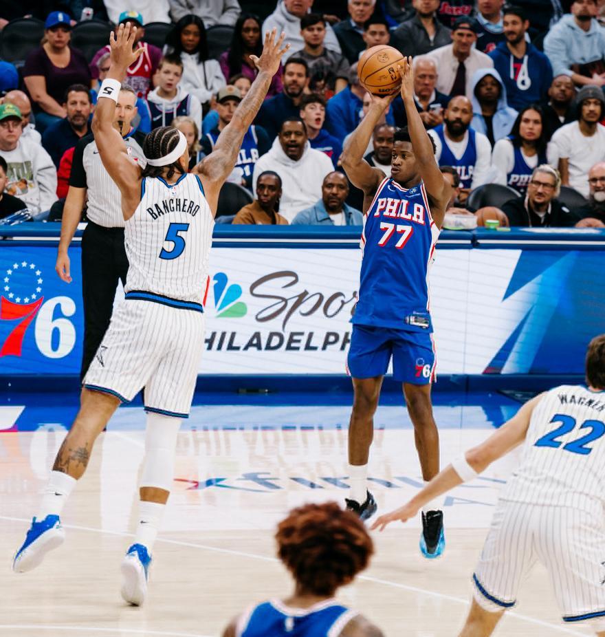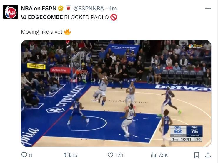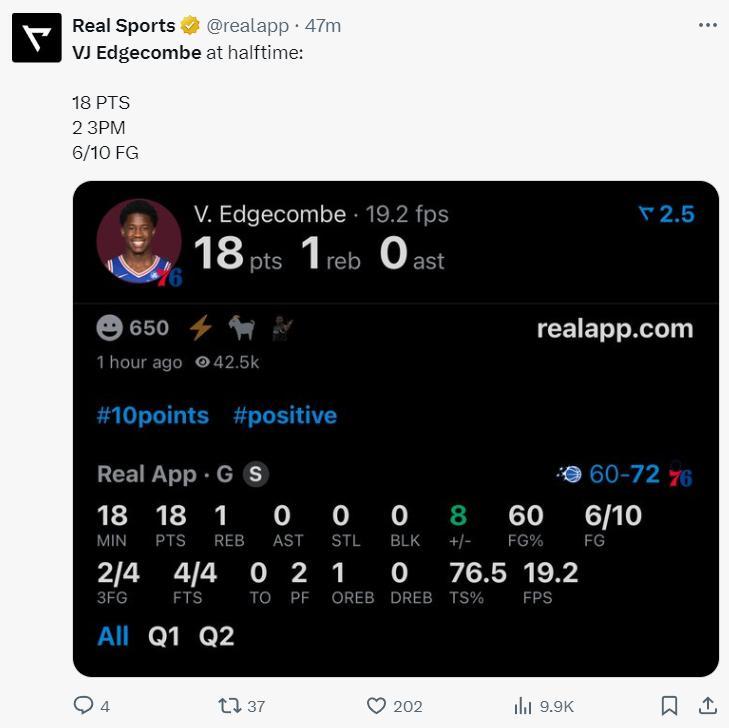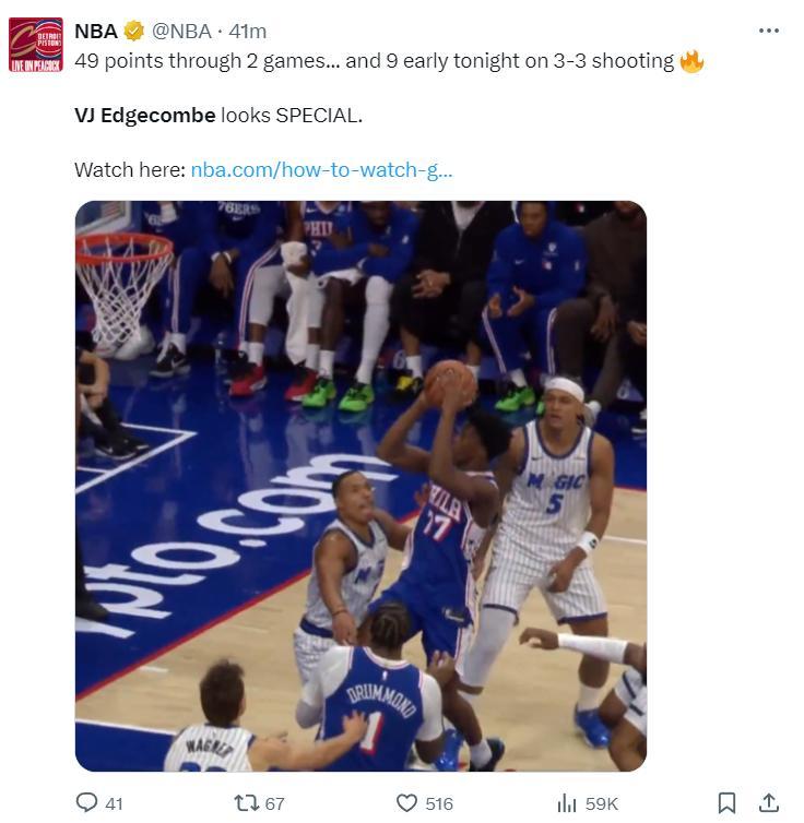 埃奇庫姆閱讀比賽的能力遠超新秀,他在三人合圍下歐洲步上籃命中,上半場17分40秒,10中6+三分4中2拿到18分4助攻1籃板。馬克西22分4助攻,烏佈雷16分6籃板,在沒有恩比德的情況下上半場領先魔術12分。