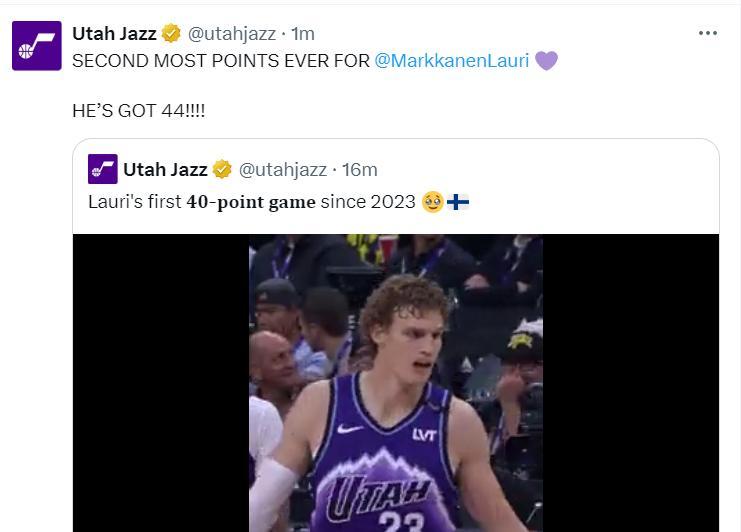 末節馬卡單節10中4+罰球5中5拿到13分2籃板,常規時間已經拿到44分13籃板,爵士官方寫道:這是馬爾卡寧2023年後首個40+,但布克兩罰一中+小奧補籃絕平,兩隊還要打加時。
