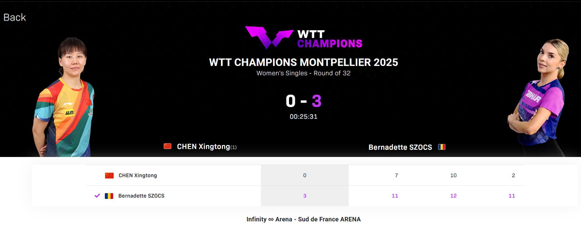 北京時間10月28日,WTT蒙彼利埃冠軍賽女單1/16決賽,陳幸同(世界第三)以0-3慘敗斯佐科斯(世界第19)首輪遊,三局比分:7-11、10-12、2-11。