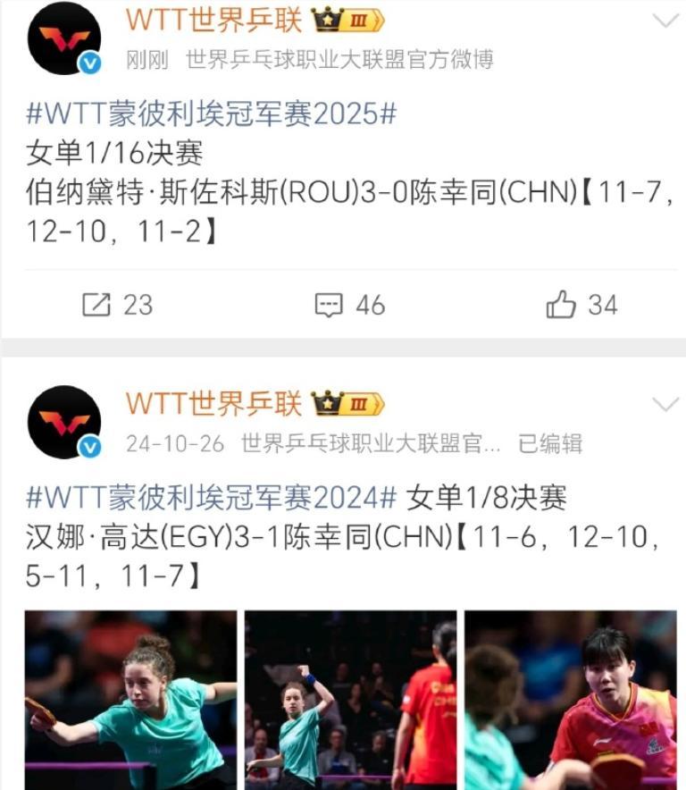 北京時間10月28日,WTT蒙彼利埃冠軍賽女單1/16決賽,30歲的老將斯佐科斯3-0淘汰了頭號種子陳幸同,三局比分:11-7、12-10、11-2,沒想到法國站第一場比賽就爆出大冷,相信全世界的球迷都驚訝了。