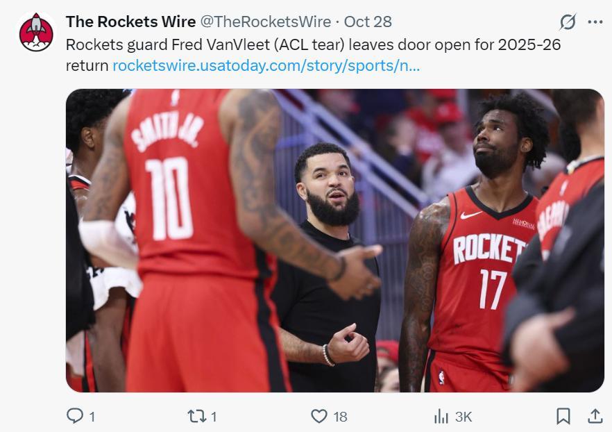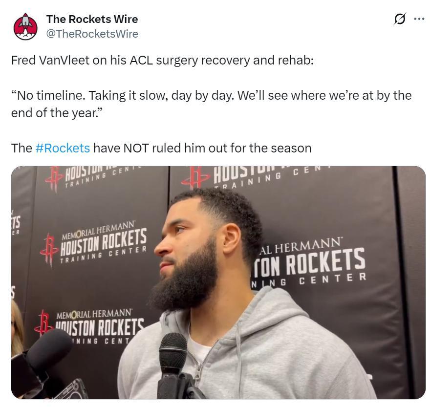 但也是10月28日,火箭另一隊記本-杜博斯的報道是這樣:範弗利特迴歸的大門並沒有關閉。文中寫道,範弗利特是9月下旬遭遇ACL撕裂,這個傷勢的康復期是9-12月,25-26賽季常規賽結束是4月12日(美國時間),總決賽會打到6月份,範弗利特如果恢復較快,他有希望在季後賽時復出。