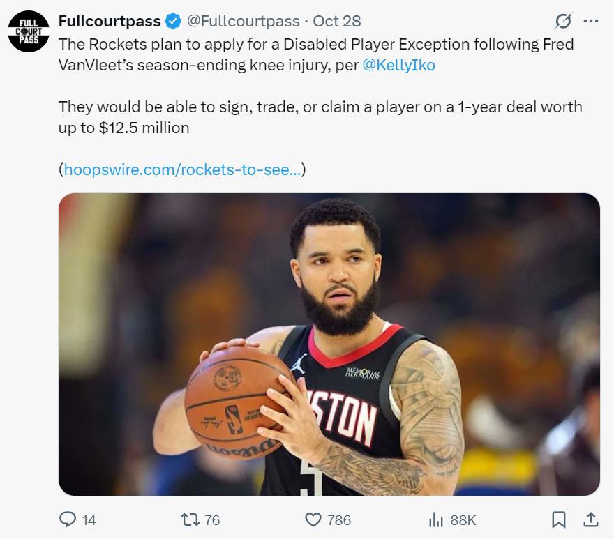 一天之前,根據美媒Fullcourtpass的消息,他說火箭隊記凱利-伊科表示,火箭隊計劃在範弗利特遭遇賽季報銷的膝蓋傷勢後申請傷病特例,範弗利特本賽季2500萬的年薪,傷病特例就是一半價值1250萬美元,傷病特例可以簽下一名、交易得到一名,或認領一名年薪最高達1250萬美元、合同期限爲一年的球員而且這名球員不會納入球隊的工資帽。