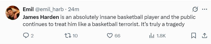 半場打完後美記:哈登是一位極其出色的籃球選手,但公衆卻一直把他當做籃球界的恐怖分子來對待,這實在是令人心痛。