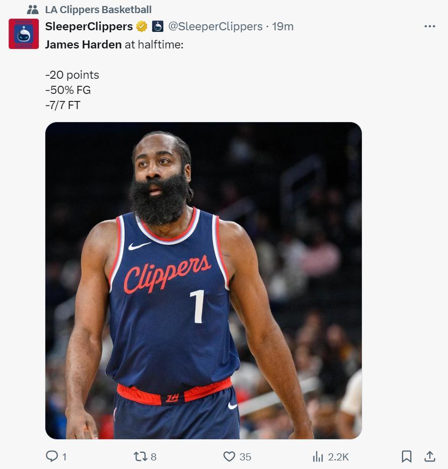 哈登整個下半場0分1助攻,全場比賽32分鐘,15中6+三分5中1+罰球7中7,拿到20分4籃板1助攻2搶斷,命中率40%,三分命中率20%。