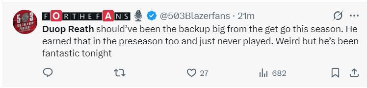 開拓者媒體:杜普-里斯本該從新賽季一開始就擔任主力替補的,他季前賽已經充分證明了他有這個實力,但一直沒有得到機會,這很奇怪。不過他這場終於得到機會且發揮很出色。