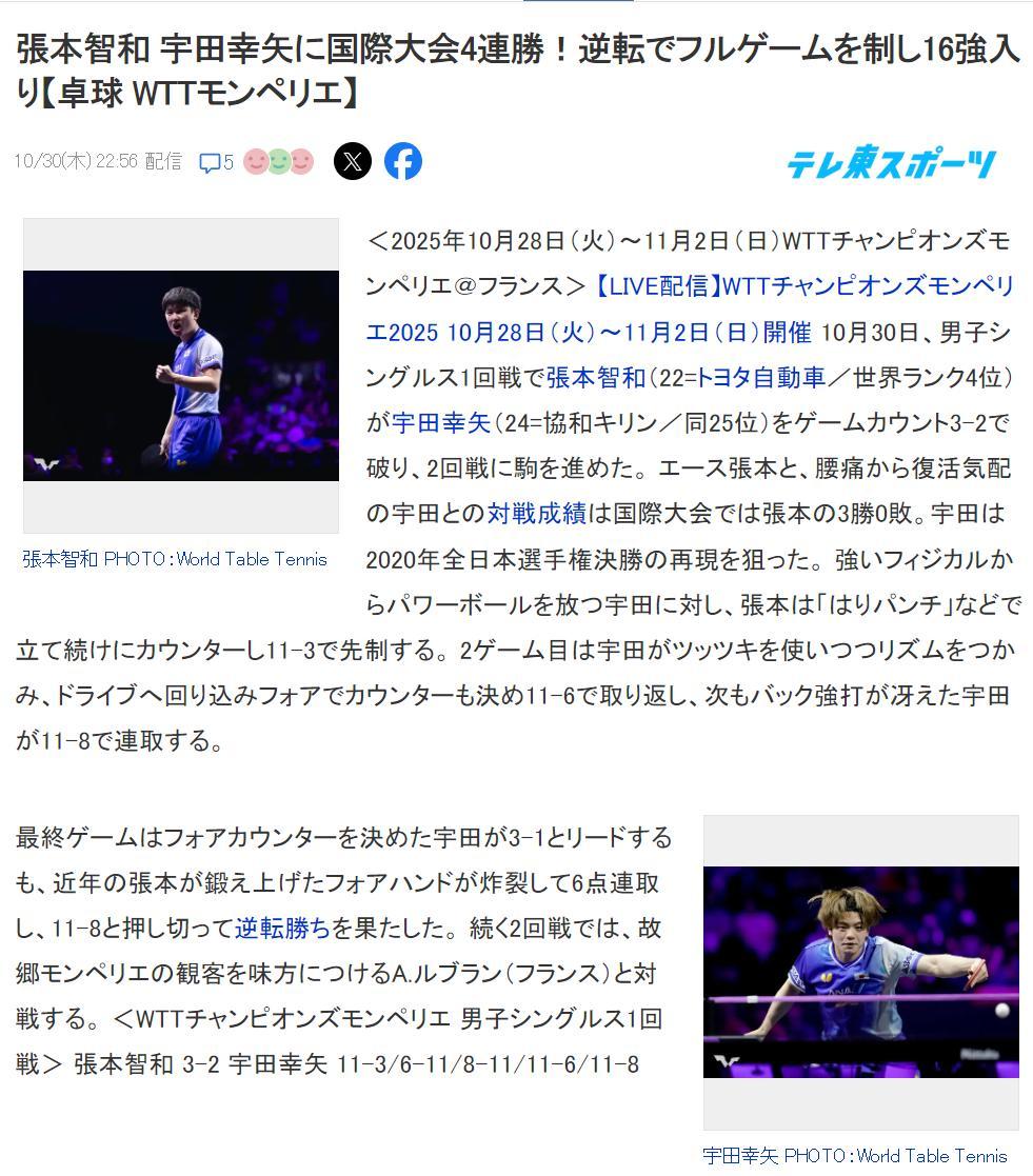 賽後日本媒體《東京體育新聞》專門報道了這場日乒內戰,文中寫道:22歲的世界排名第四3-2逆轉了24歲的世界排名24,這場比賽張本智和選手險些就被宇田幸矢選手擊敗,宇田幸矢選手差一點就復刻了2020年全日本錦標賽決賽擊敗王牌張本選手,此役後宇田選手在國際賽場與張本選手的交手戰績改爲爲0勝4負。