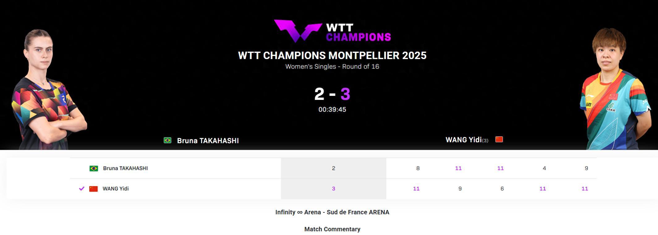 決勝局開場布魯娜2-1領先,王藝迪2-2扳平,隨後4-4,布魯娜6-5反超,布魯娜8-5拉開分差,王藝迪頂住壓力8-8扳平,王藝迪連拿第4分9-8反超,王藝迪10-9賽點,最終王藝迪11-9拿下最後的勝利。