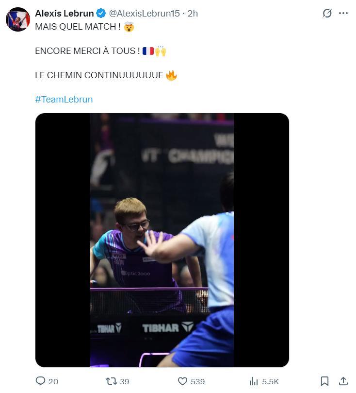 賽後大勒布倫在個人X上寫道:這是一場精彩的比賽,謝謝大家的加油,比賽還將繼續。